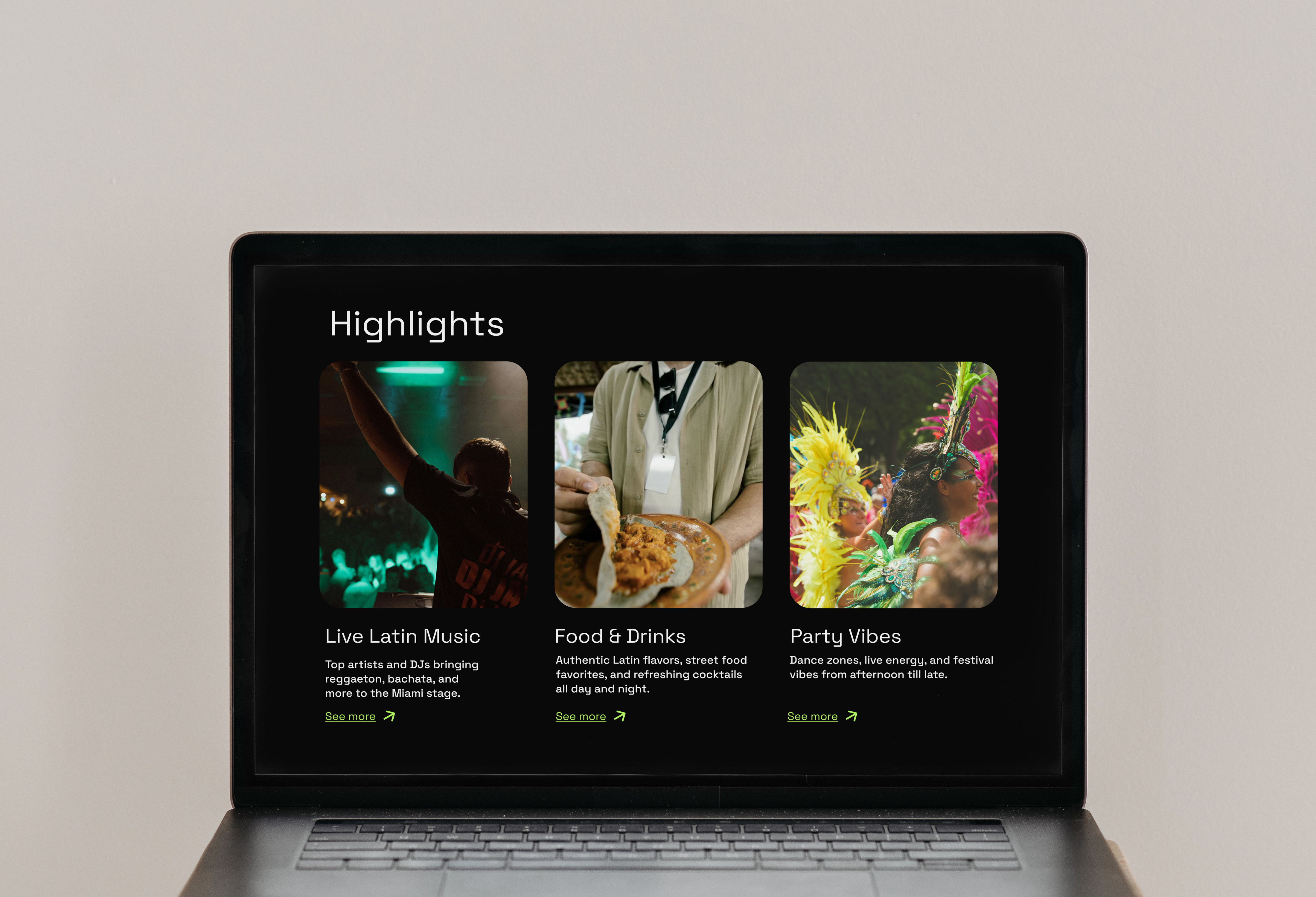 A festival event pass and a landing page design for a Latin music and culture festival